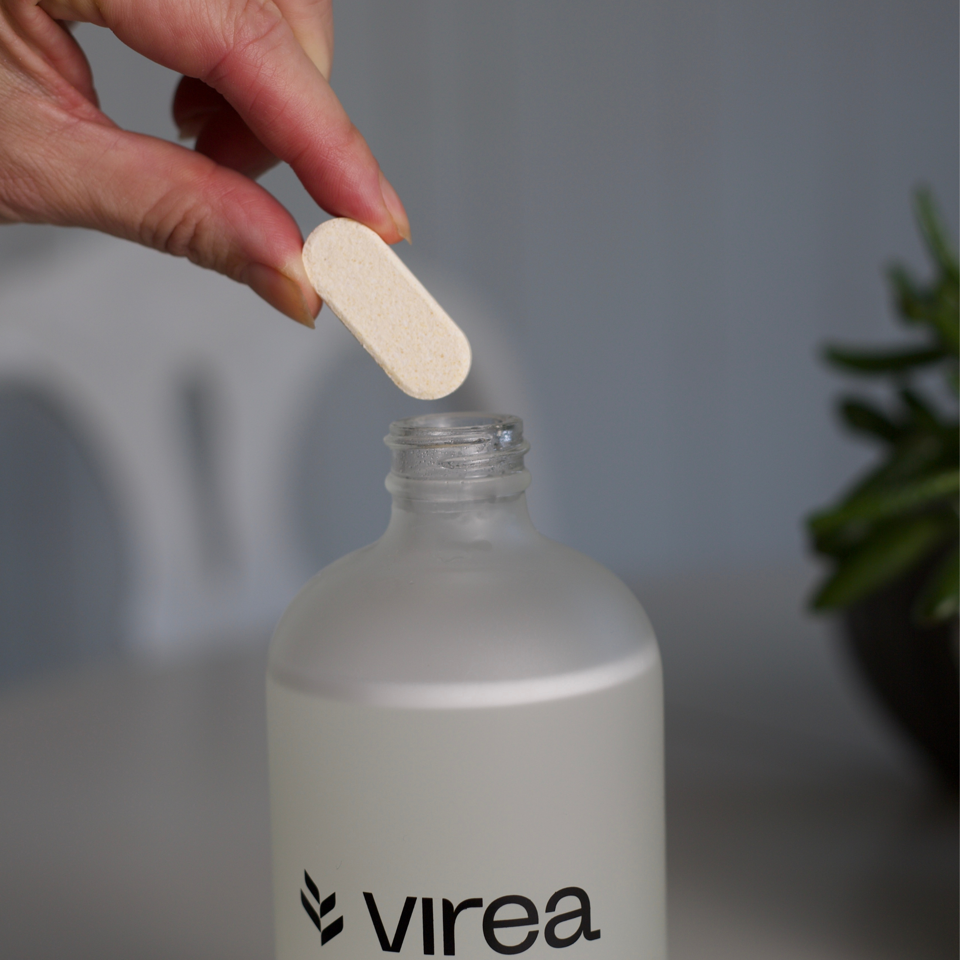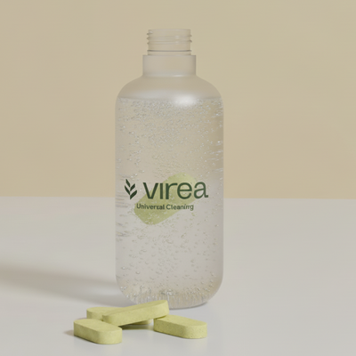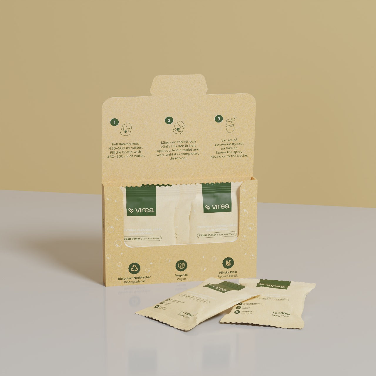 Rengør smartere – og mere skånsomt for planeten. Vores kraftfulde rengøringstabletter forvandles til en effektiv universalrengøringsspray, når du blander dem med vand derhjemme. Ingen unødvendigt plastspild, ingen tung vandtransport – kun ren overflade og frisk citrondoft.